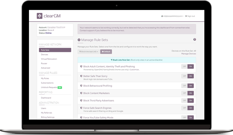 From the dashboard you can create and apply a different rule sets to different devices. This allows you to customize each Internet user’s experience.